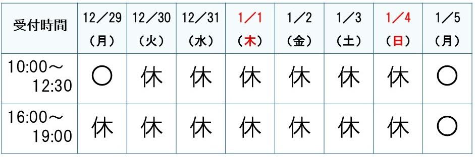 年内の診察は12月29日(月)の午前中までとなります。12月29日(月)の午後の診察から1月4日(日)まで休診となります。
